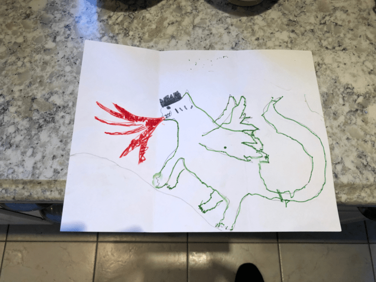 The author of this amusing well wish is my mom’s latest ward, 5 yr old Peter from up the block. This is a pretty bad ass dragon if you ask me! 5 year old me would nod with silent approval.
